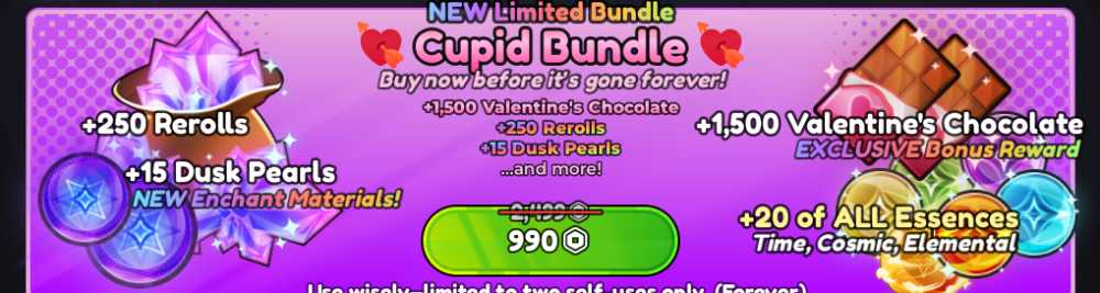 Bought with 1k robux. Contains 250 rrss + 15 dusk pearls + 1.5K Valentine chocolate + MORE.